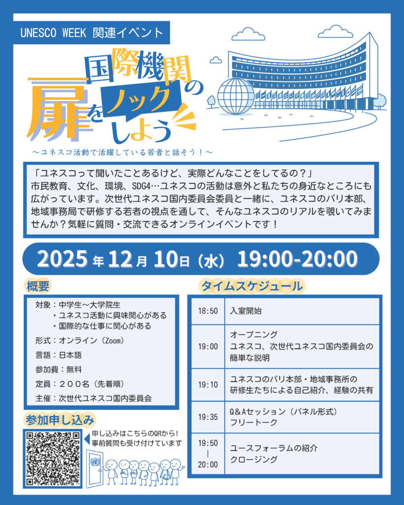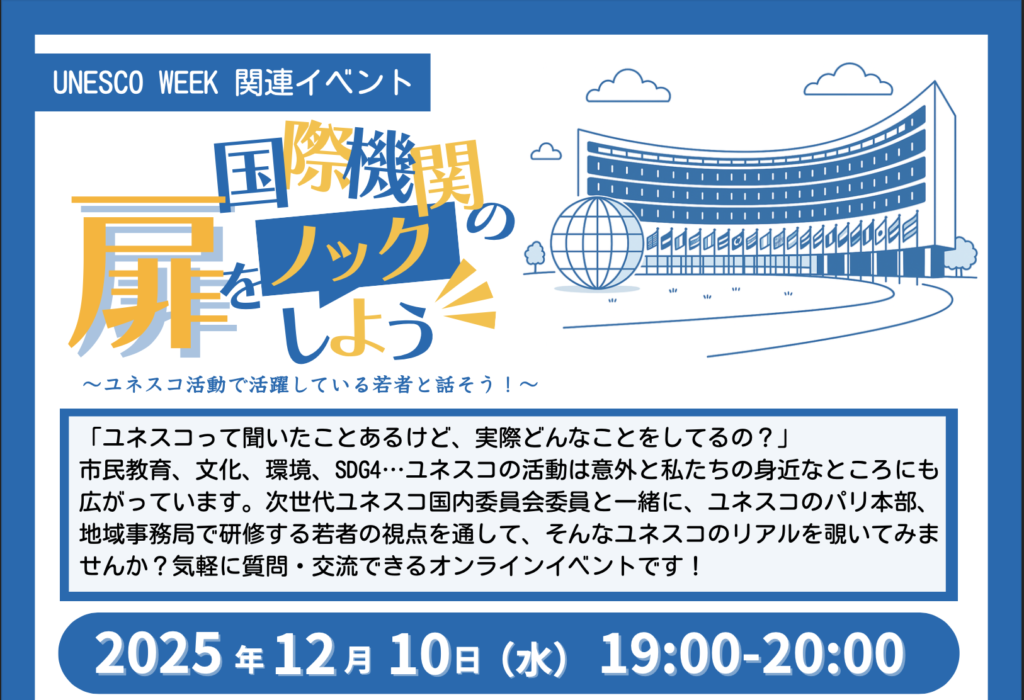 【参加無料!12/10 開催】「国際機関(ユネスコ)の扉をノックしよう」~ユネスコ活動で活躍している若者と話そう!~