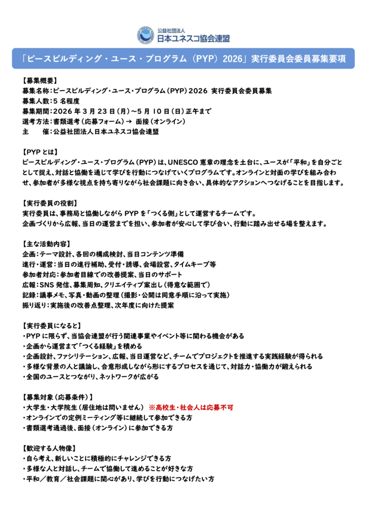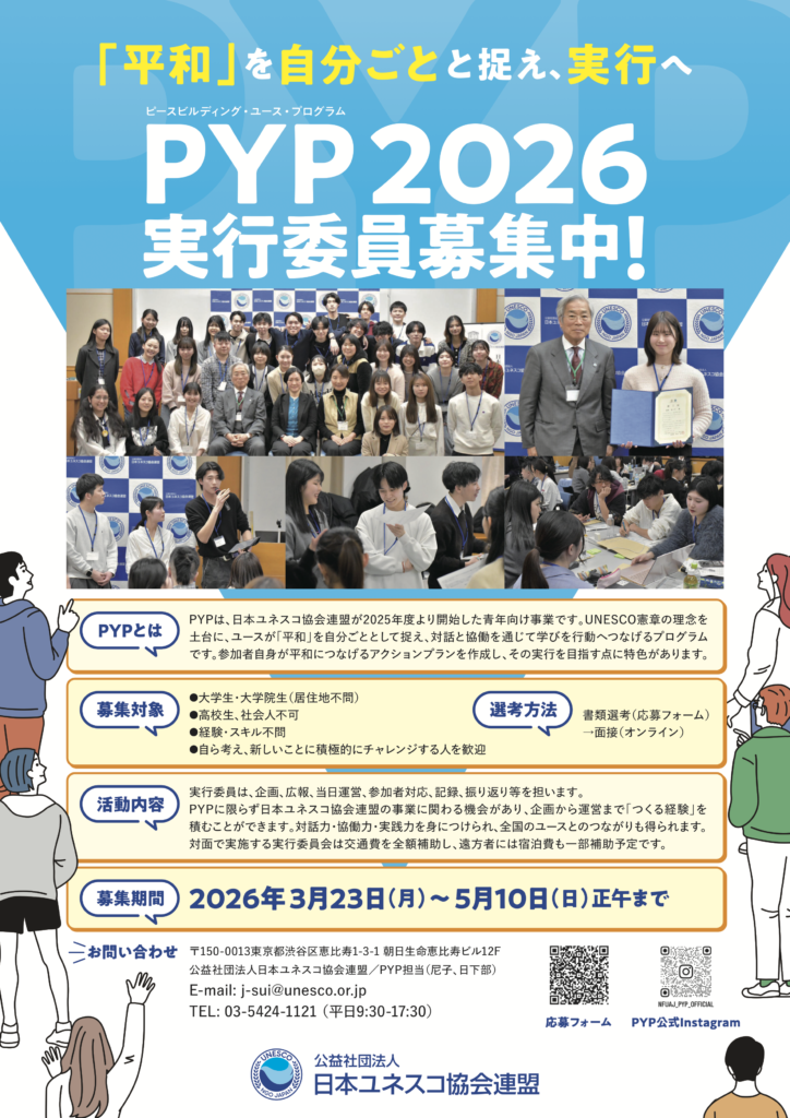 日本ユネスコ協会連盟は、2025年度より開始した青年向け事業「ピースビルディング・ユース・プログラム(PYP)」の運営に向け、2026年度PYP実行委員を募集します。